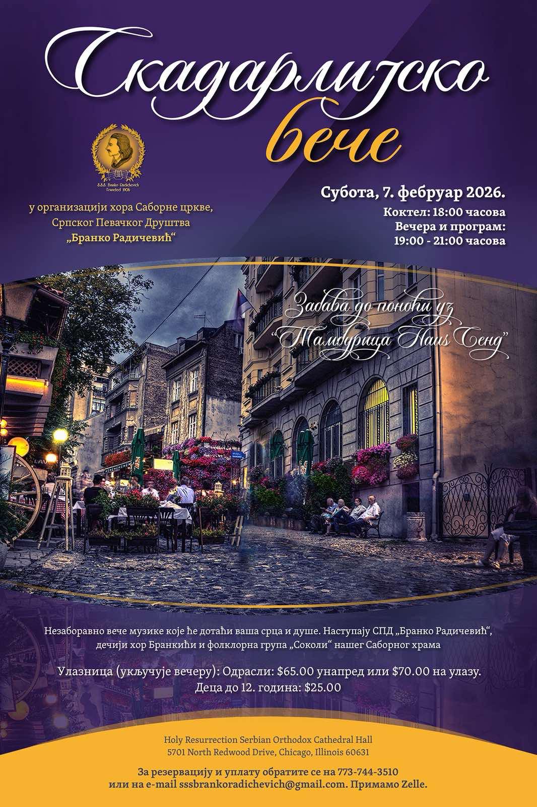 Са великом радошћу вас позивамо на Скадарлијско вече, посебно музичко и културно дружење које нас духом води у боемску Скадарлију — срце старог Београда, где се