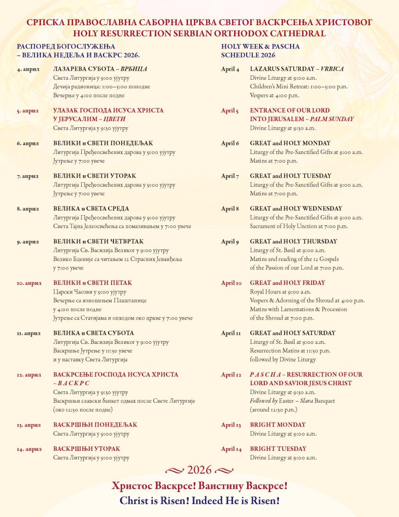 | Saturday, April 4 | Lazarus Saturday – Vrbica | 9:00 a.m. Divine Liturgy 1:00 p.m. – 5:00 p.m. Children’s Mini Retreat 4:00 p.m. Vespers |