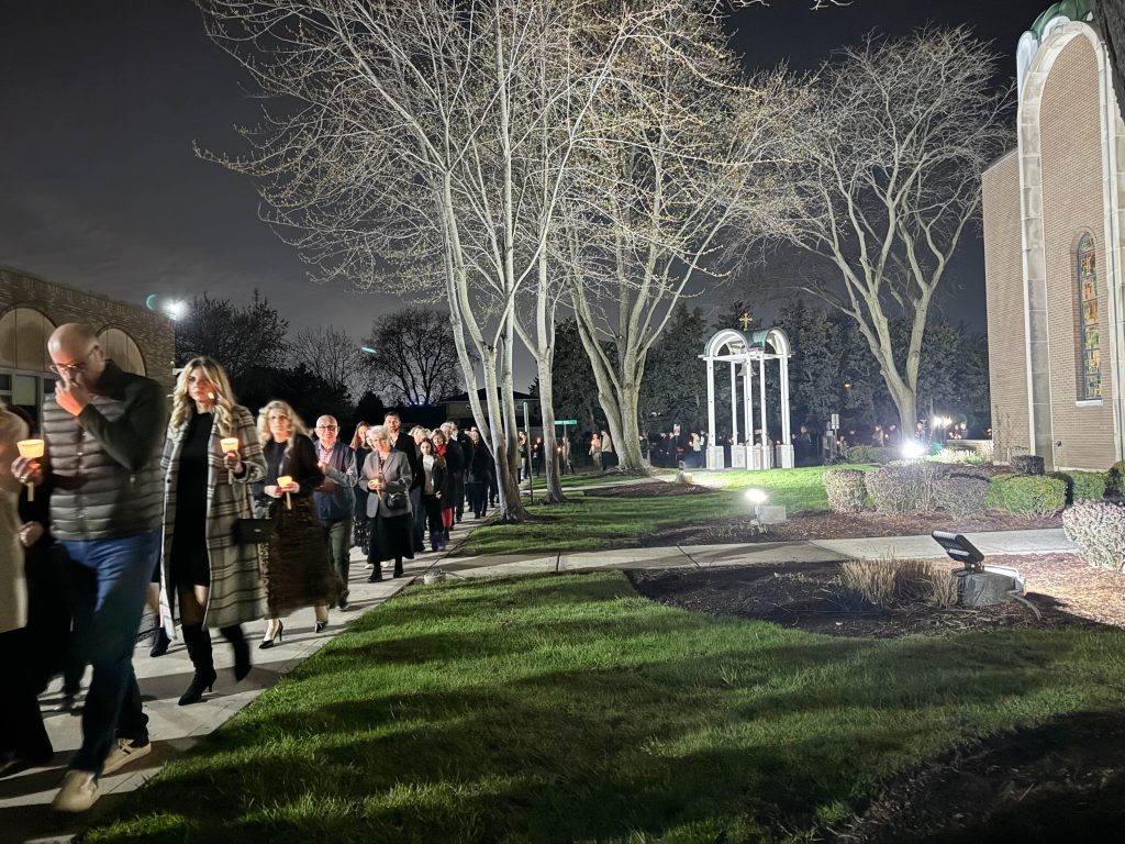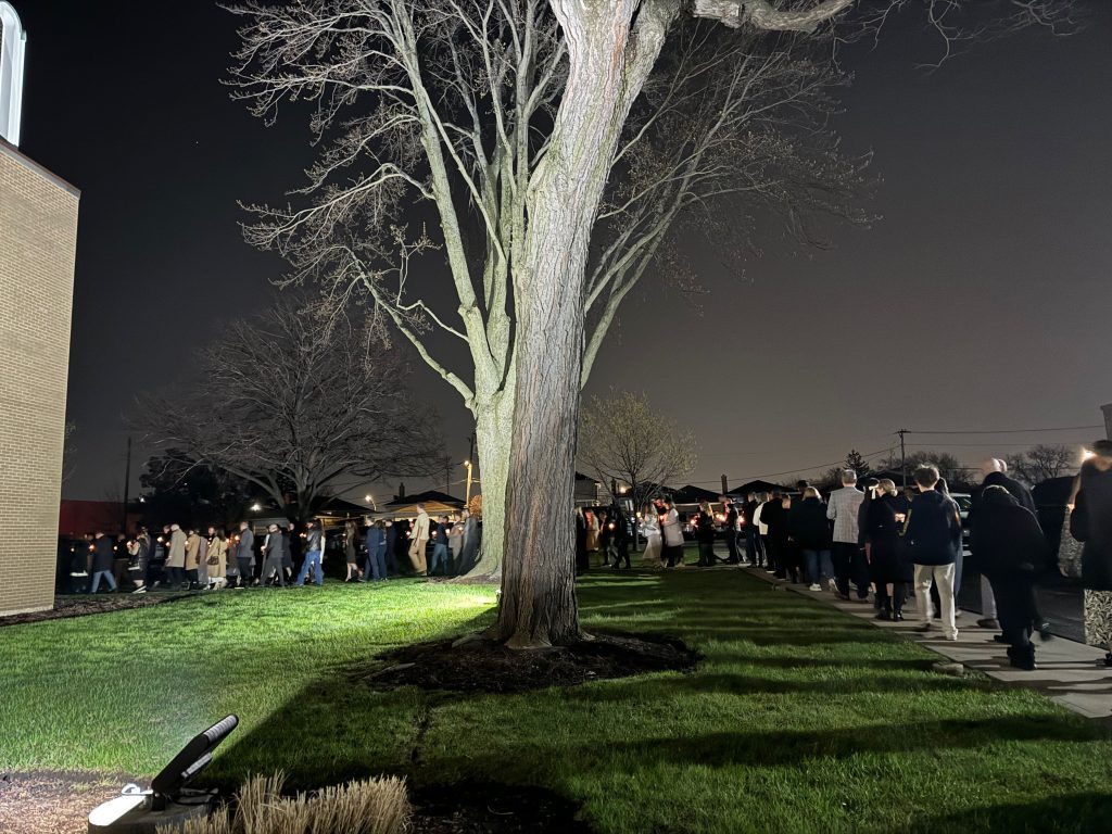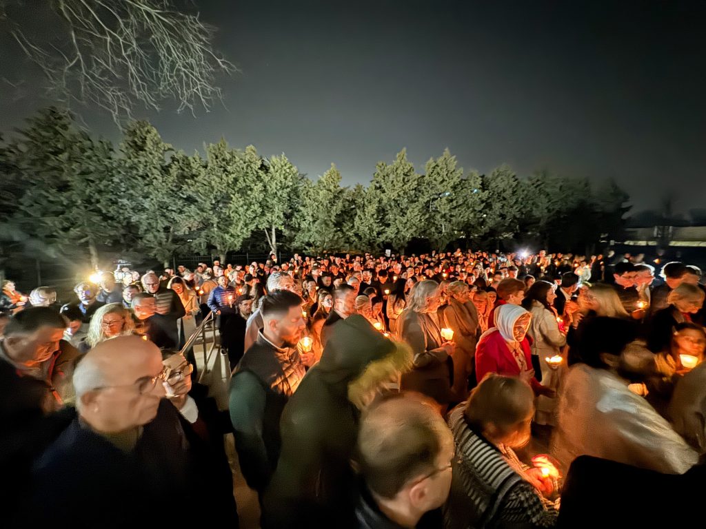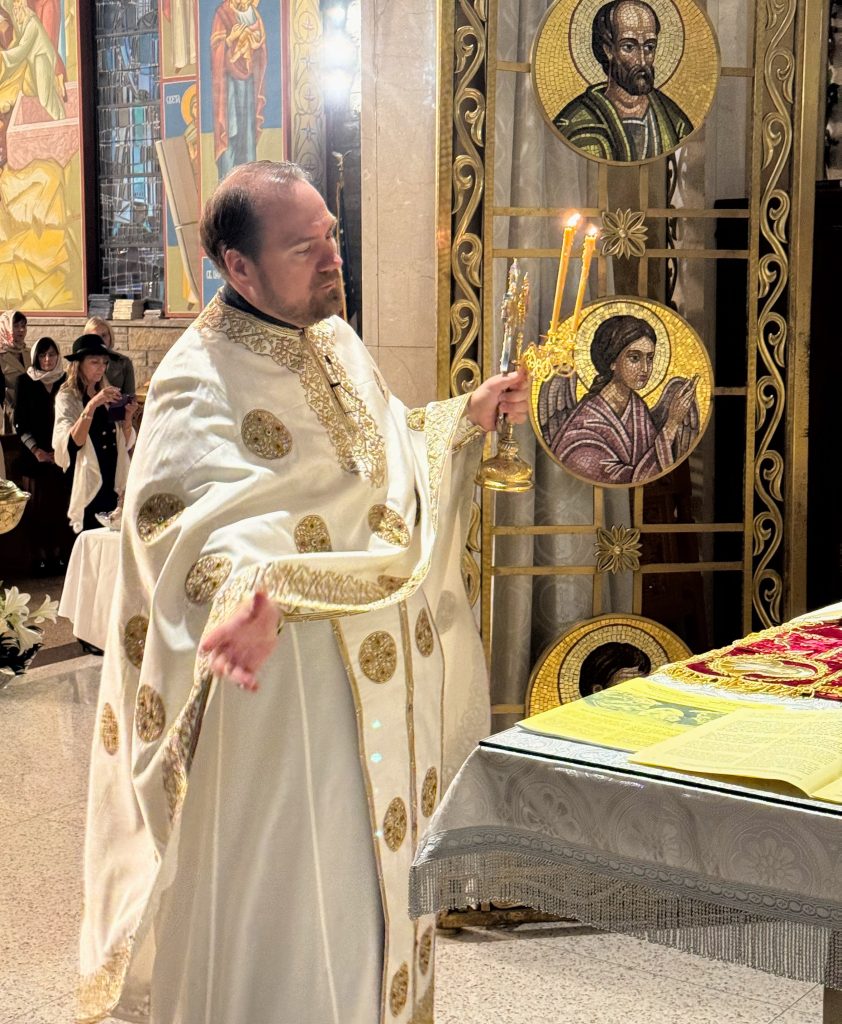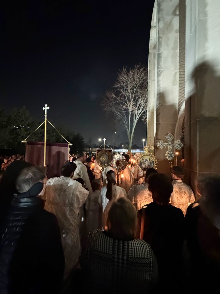 The service began in solemn anticipation with a candlelit procession led by the clergy, joined by the faithful as they circled the church three times in remembrance of the Myrrh-bearing women’s journey to the tomb. At the conclusion of the procession, we gathered before the closed doors of the Cathedral. It was there, in the stillness of the night, that the glorious proclamation of Christ’s victory over death resounded: “Let God arise, and let His enemies be scattered!”
