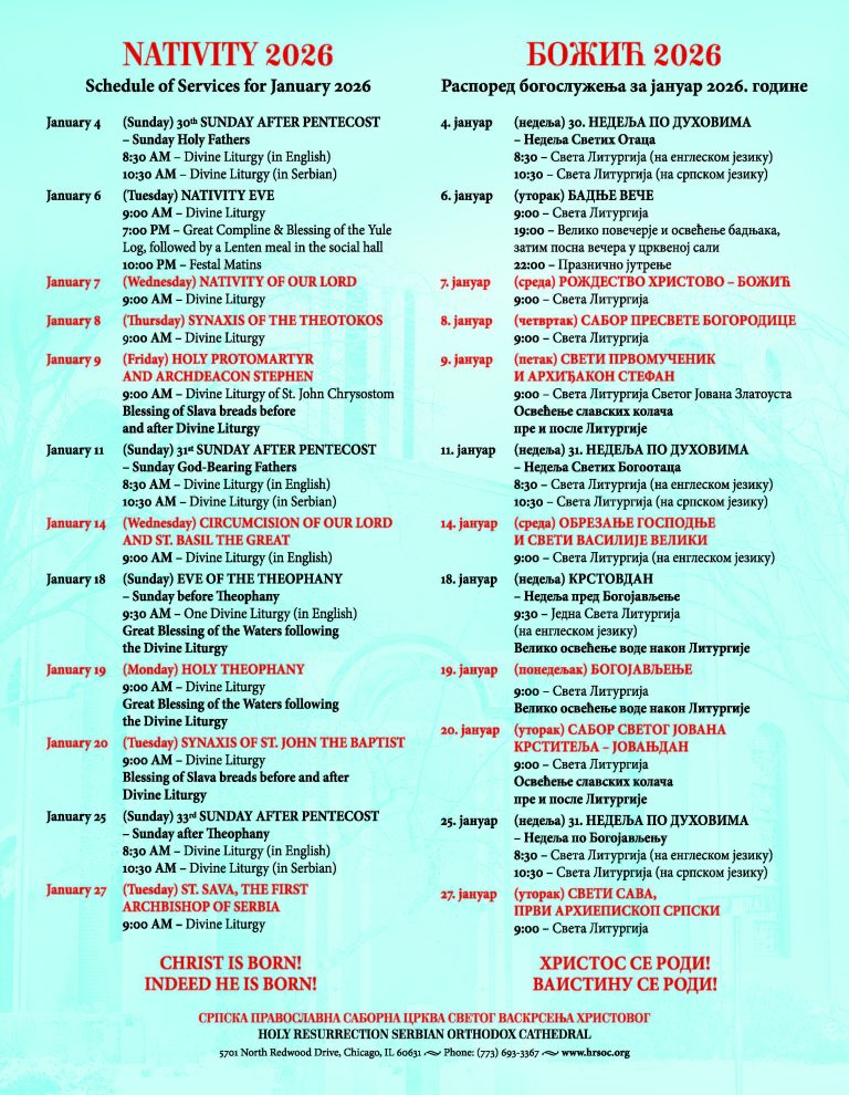 Below is the full schedule of liturgical services for January 2026 at Holy Resurrection Serbian Orthodox Cathedral. All are warmly welcome to attend and celebrate these sacred days together as one parish family.